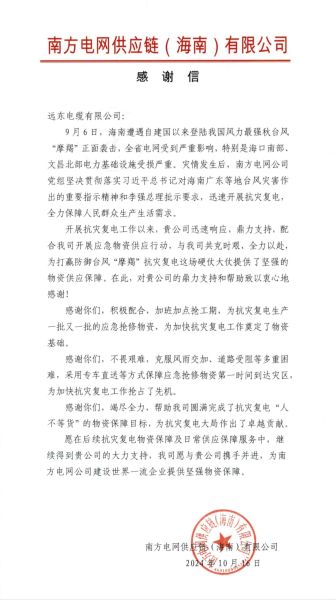 近日,南方電網(wǎng)供應(yīng)鏈(海南)有限公司發(fā)來(lái)感謝信,對(duì)遠(yuǎn)東電纜在關(guān)鍵時(shí)刻伸出援手表示衷心感謝,并期待在未來(lái)能夠與遠(yuǎn)東電纜深化合作,共同為國(guó)民基礎(chǔ)供應(yīng)服務(wù)提供更加堅(jiān)強(qiáng)有力的物資保障。